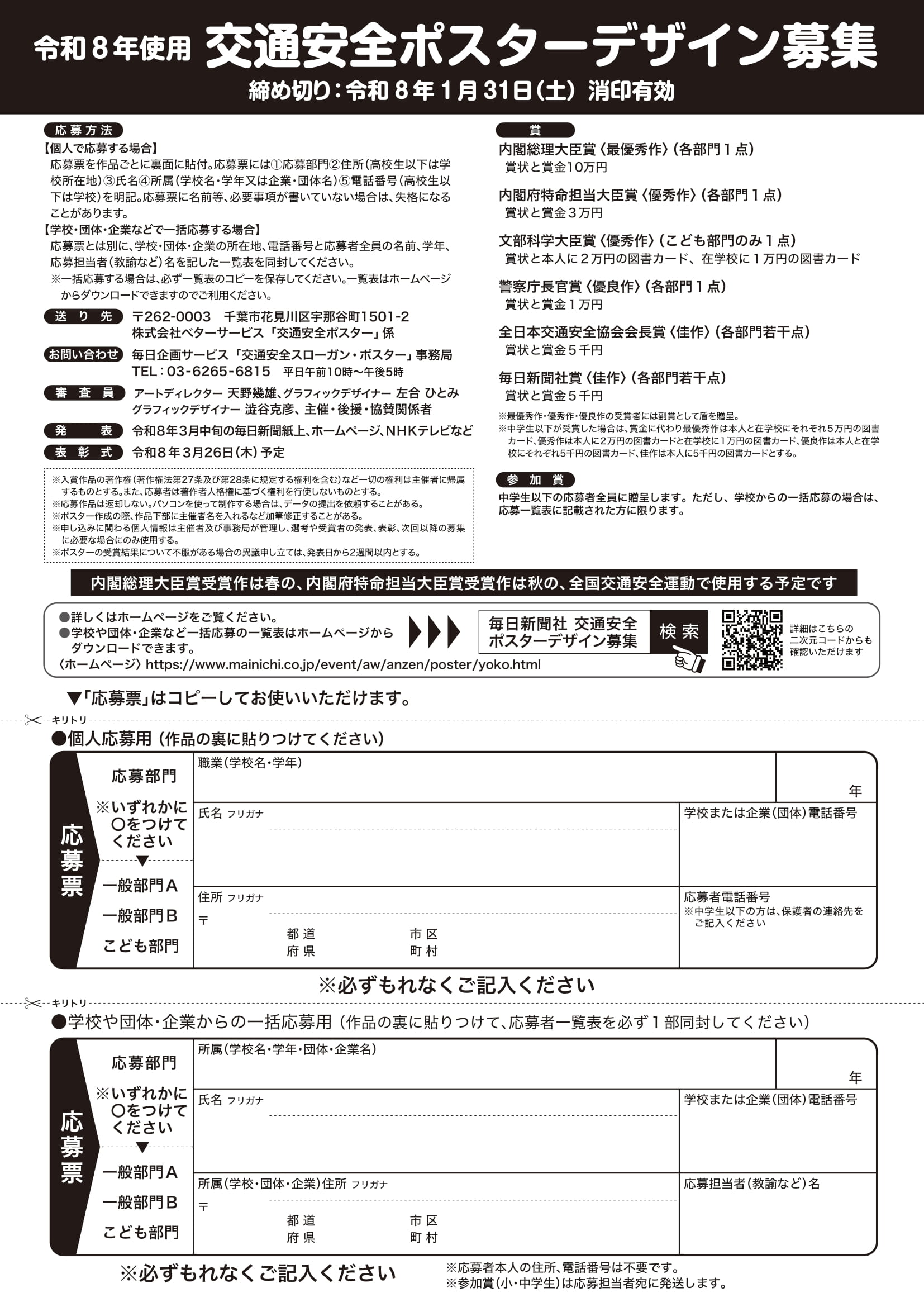 詳しくは、「毎日新聞社 交通安全ポスターデザイン募集」で検索してください。