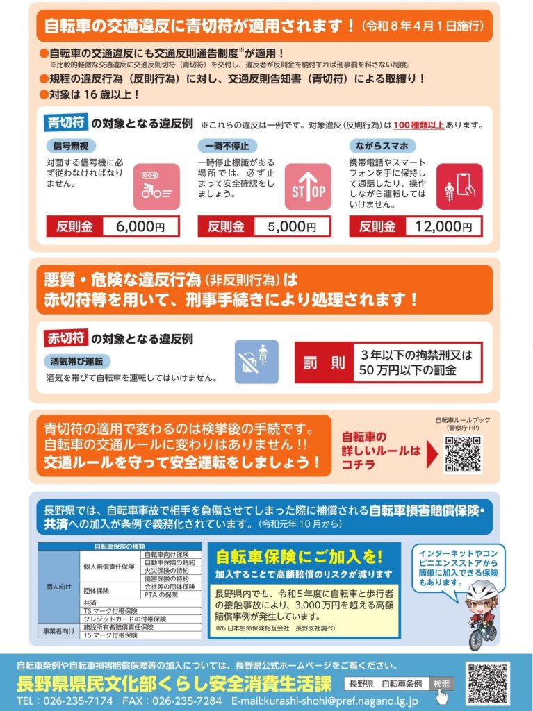 本年4月1日から、道路交通法改正に伴い、16歳以上の自転車運転者による一定の違反に交通反則通告制度、いわゆる「青切符」制度が適用されます。